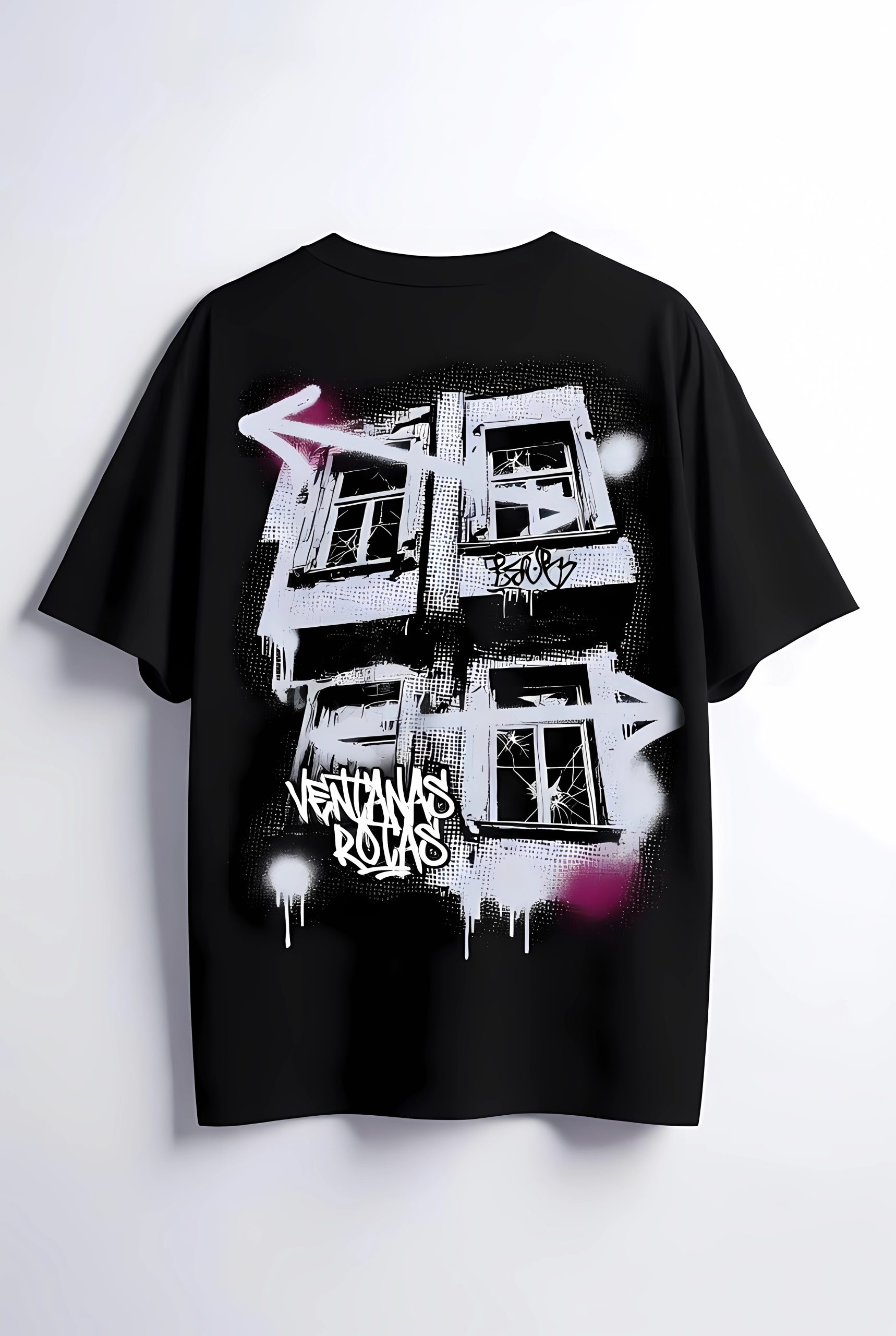 <p>Camiseta negra oversize con impresión de alta calidad que representa un edificio urbano deteriorado, ventanas rotas y grafitis auténticos. El arte combina técnica de halftone (puntos), drips de pintura y acentos magenta que resaltan en la oscuridad de la prenda.</p>